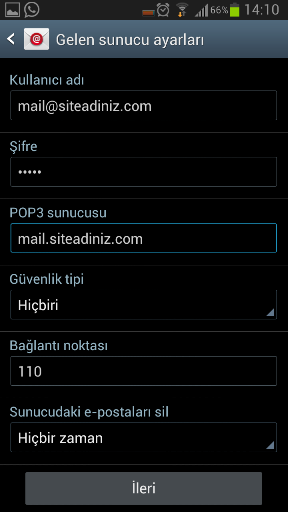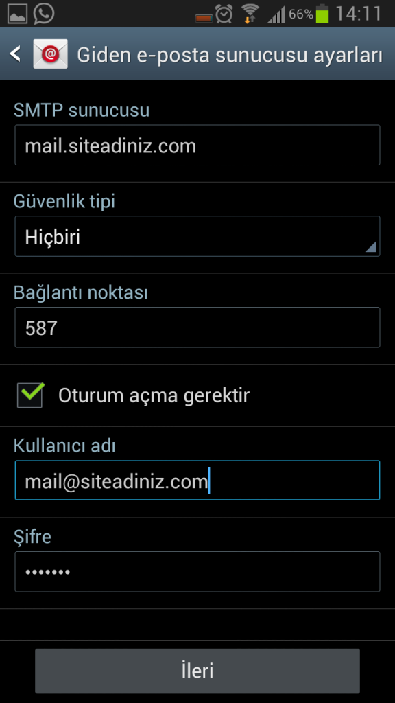 Adım 4 : Kullanıcı adınıza mail@siteadiniz.com , Güvenlik Tipi bölümüne “Hiçbiri” seçeneğini işaretleyiniz, “İleri” butonunu tıklayınız.